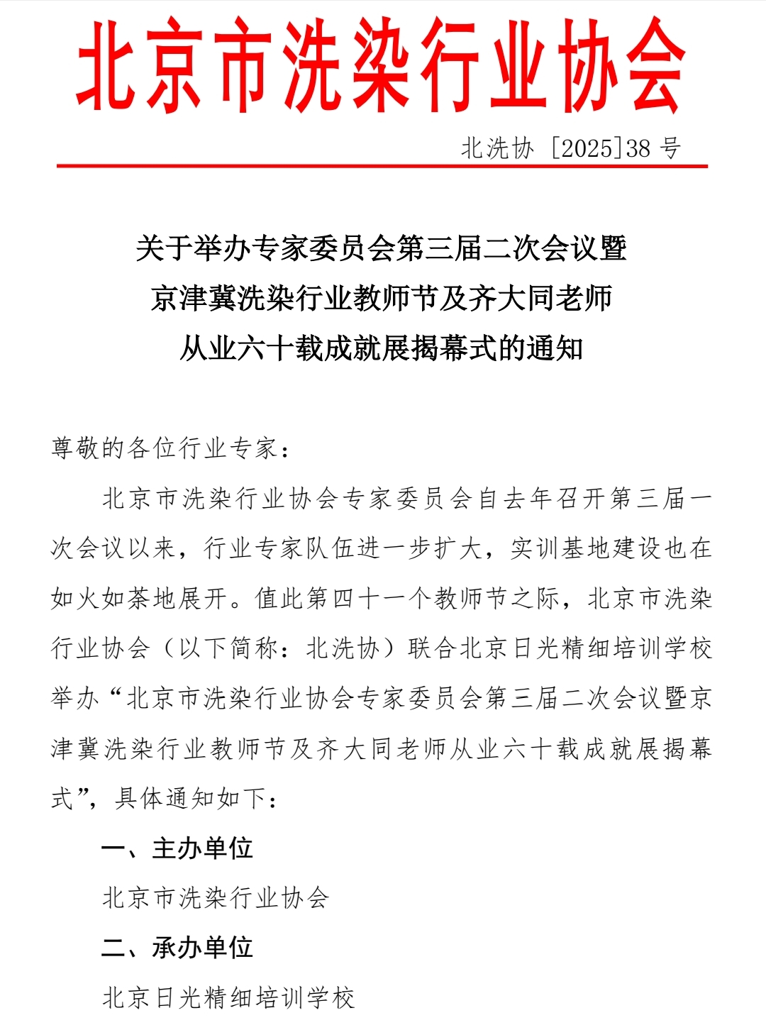 关于举办专家委员会第三届二次会议暨京津冀洗染行业教师节及齐大同老师从业六十载成就展揭幕式的通知2025年09月08日