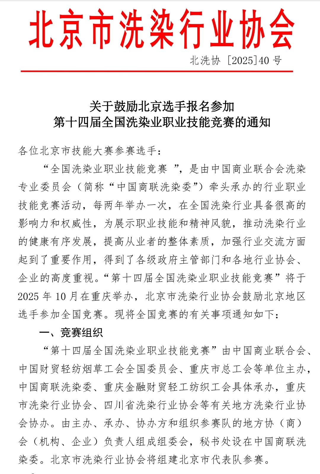 关于鼓励北京选手报名参加第十四届全国洗染业职业技能竞赛的通知2025年09月11日 -