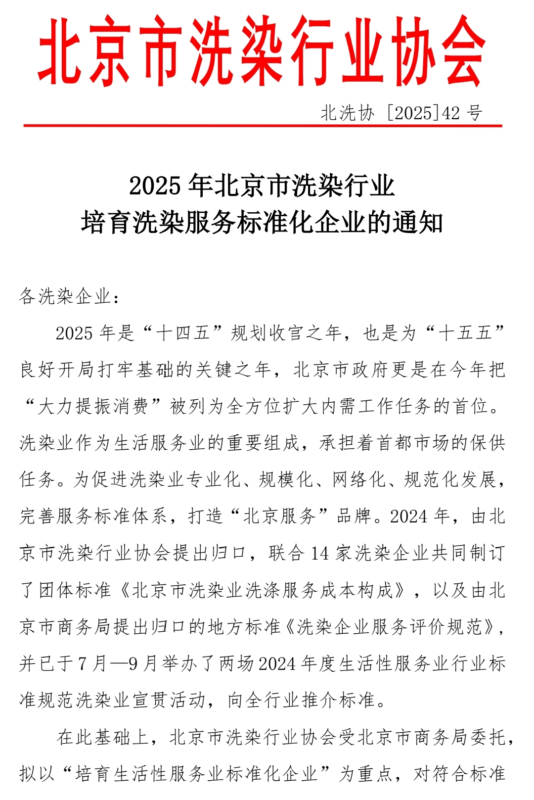 2025年北京市洗染行业培育洗染服务标准化企业的通知2025年09月25日