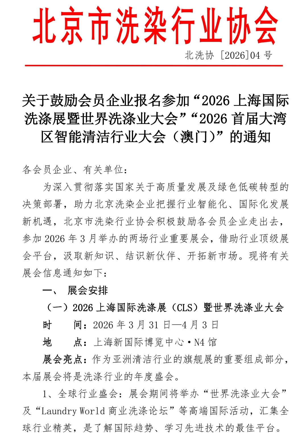 关于鼓励会员企业报名参加“2026上海国际洗涤展暨世界洗涤业大会”“2026首届大湾区智能清洁行业大会(澳门)”的通知