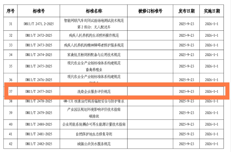 由北京市发布的地方标准《洗染企业服务评价规范》(标准号:DB11/T 2477-2025)已于2025年9月23日正式发布,将于2026年1月1日起正式实施。