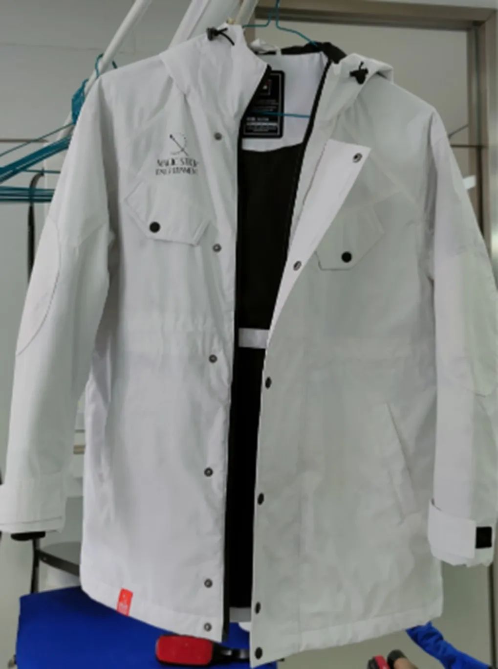 事故原因:该衣物黑白配色,黑色里衬面料掉色,会沾染白色面料,且覆膜面料易沾染颜色,使衣物难于修复。