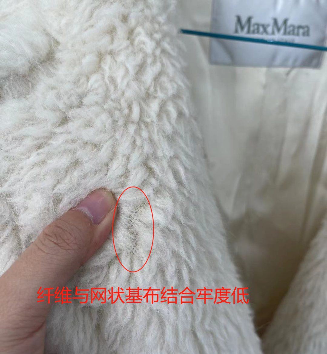 事故原因:此款羊毛大衣在洗后出现掉毛现象,且洗涤次数越多掉毛越严重,已多次出现洗涤事故。衣物脱毛为面料织造时纤维与网状基布结合牢度低所致。