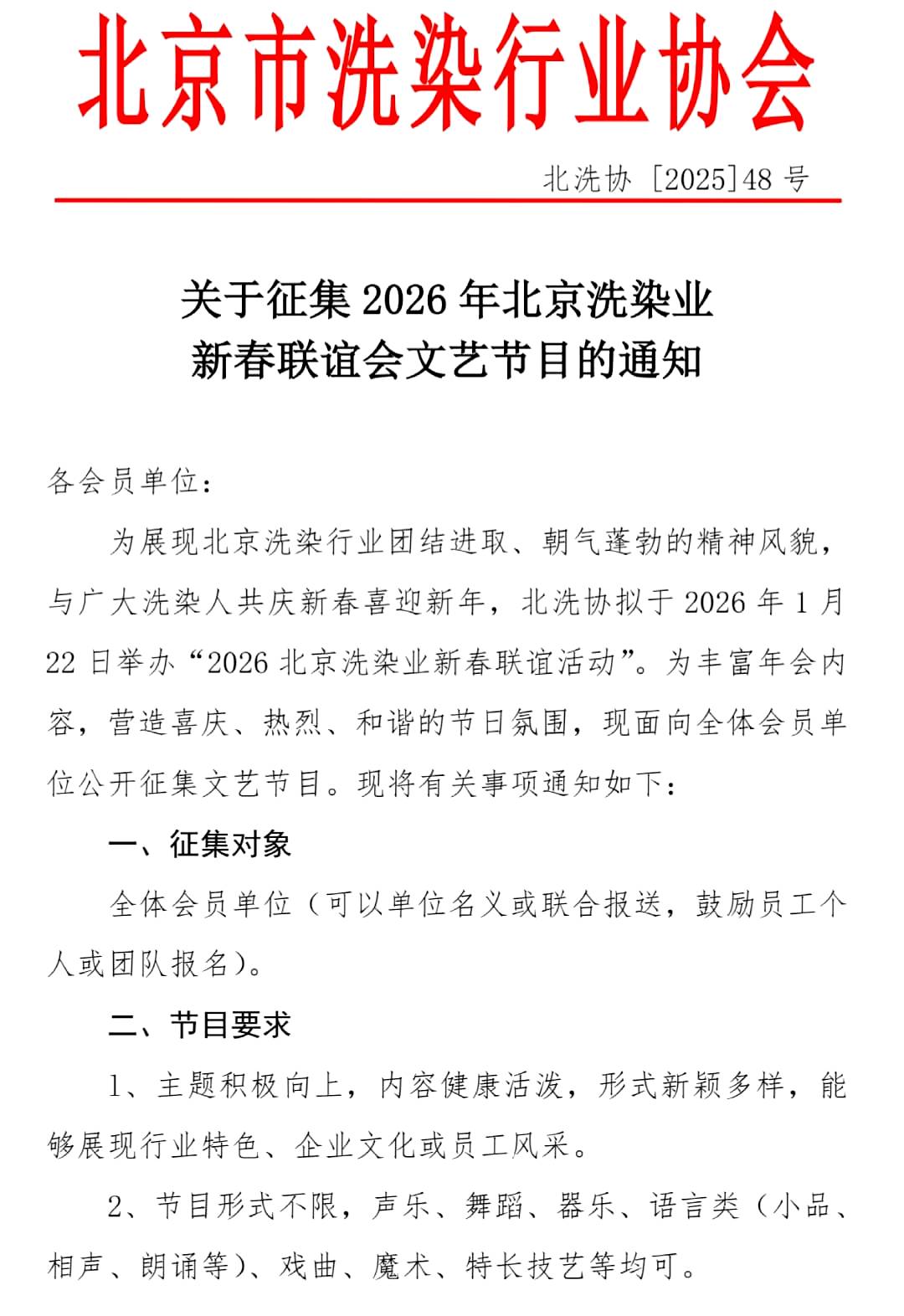 关于征集2026年北京洗染业新春联谊会文艺节目的通知