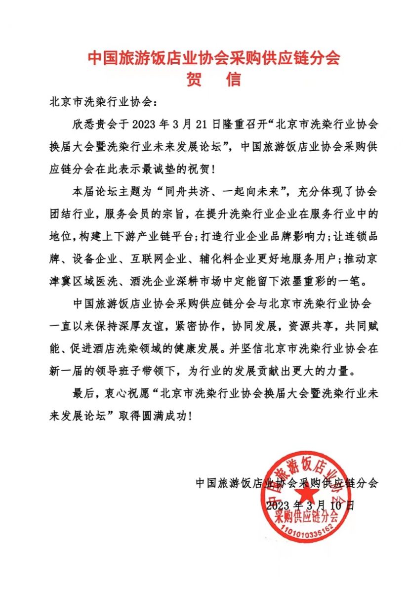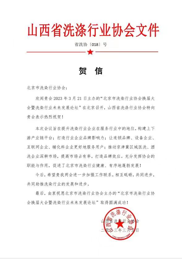 自2023年3月1日,北京市洗染行业协会正式对外宣布:北京市洗染行业协会换届大会暨洗染行业未来发展论坛将于3月21日召开。全国各地贺信、贺函及参会回执纷至沓来:中国商业联合会洗染专业委员会、中国洗涤用品工业协会、全国卫生产业企业管理协会医疗洗涤消毒分会、中国旅游饭店业协会采购供应链分会、中国轻工机械协会、河北省商业联合会洗染专业委员会、上海洗染业行业协会、天津市洗染行业协会、北京日化协会、浙江省洗染行业协会、黑龙江省洗染行业协会、江西省洗涤行业协会、辽宁省洗染行业协会、内蒙古洗染行业协会、山西省洗涤行业协会、陕西省洗染行业协会、青海省洗染行业协会、吉林省洗染行业协会、湖南省洗涤行业协会、大连市洗染行业协会、长春市洗染行业协会、北京洁希亚洗染技术有限公司等多家单位高度评价北京市洗染行业协会作为全国的领跑者、排头兵,带动全国洗染行业一起稳步向前。同时,表达与北京市洗染行业协会继续双向交流、信息共享、技术互鉴,合力谱写洗染行业共同发展新篇章的意愿。下面,一睹为快各单位诚挚的贺信: