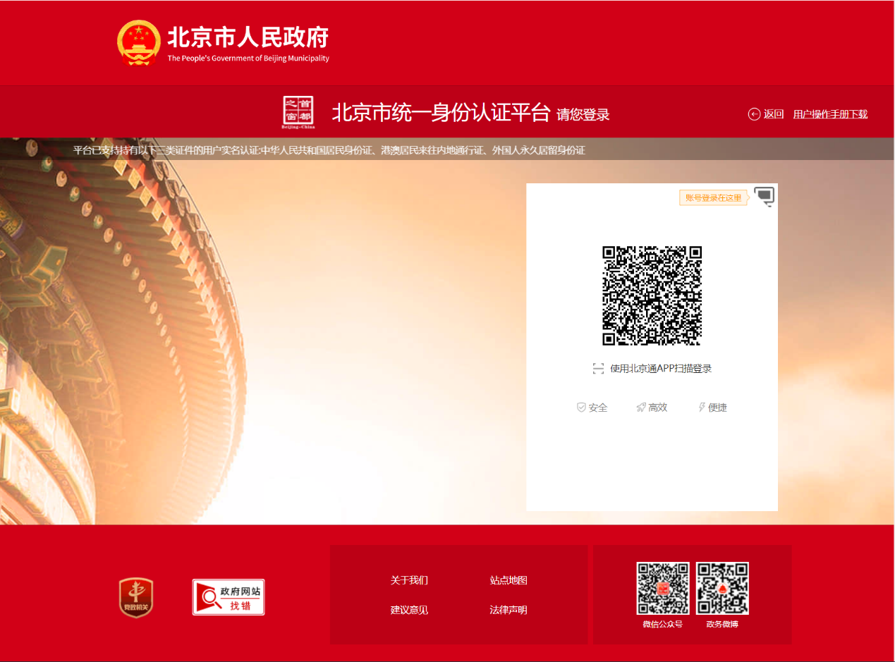1. 北京市统一身份认证平台,为北京市人民政府主办,面向自然人办事的统一登陆入口。如从未注册过北京市统一身份认证平台用户,则点击登录窗口下方的立即注册按钮进行注册。